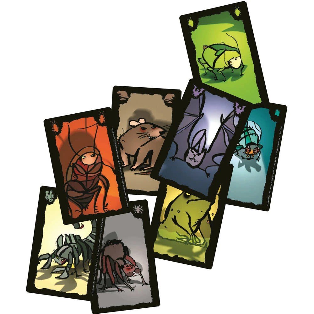 Kakkerlakken Poker bestaat uit 64 kaarten en acht verschillende soorten dieren. Deze diersoorten zijn niet bepaald schattig of lief. Alleen spelers met een sterke maag kunnen bluffen met deze kaarten met daarop een afbeelding van een vleermuis, vlieg, pad, kakkerlak, rat, schorpioen, spin of tor. De speler die als eerste vier kaarten van &eancute;&eancute;n diersoort heeft of die als eerste door zijn/haar kaarten heen is, is de verliezer.