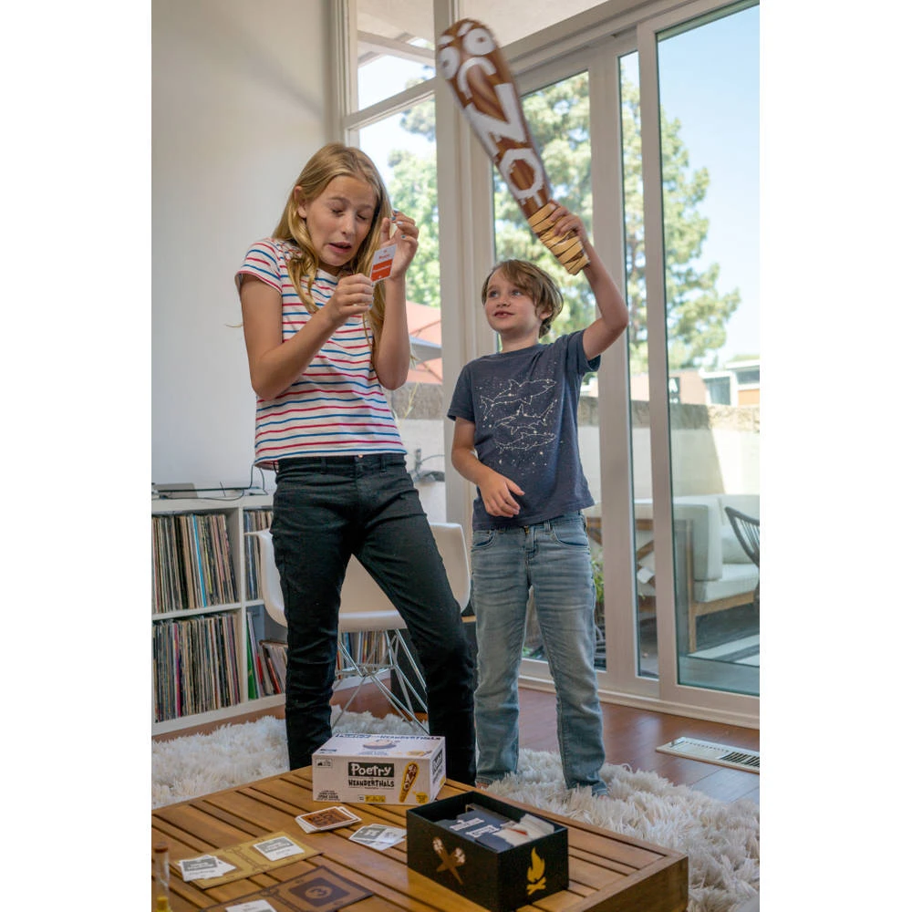 In Poetry for Neanderthals verdienen spelers punten door als dichtende Neanderthalers hun teamgenoten woorden en begrippen te laten raden. Maar let op: als Neanderthaler ken je alleen woorden met 1 lettergreep… Gebruik je woorden met meer dan 1 lettergreep, dan krijg je van het andere team een klap met de opblaasbare knuppel! Het team met de meeste punten wint!