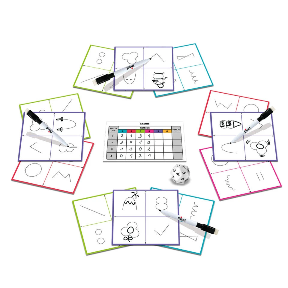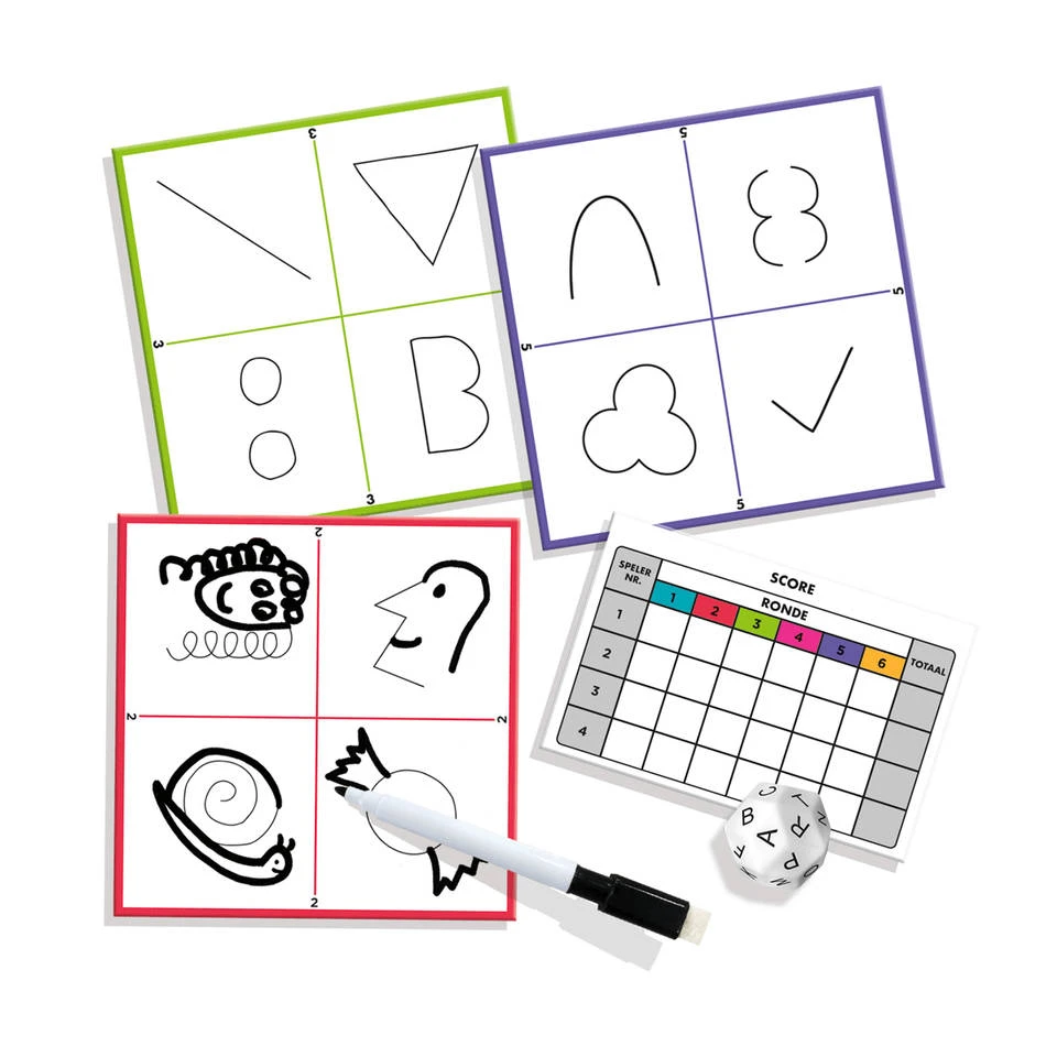 - Bij het spelen van het Party & Co Sketch partyspel maak je gebruik van het tekenbord dat al een aantal krabbels bevat waar je gebruik van moet maken.