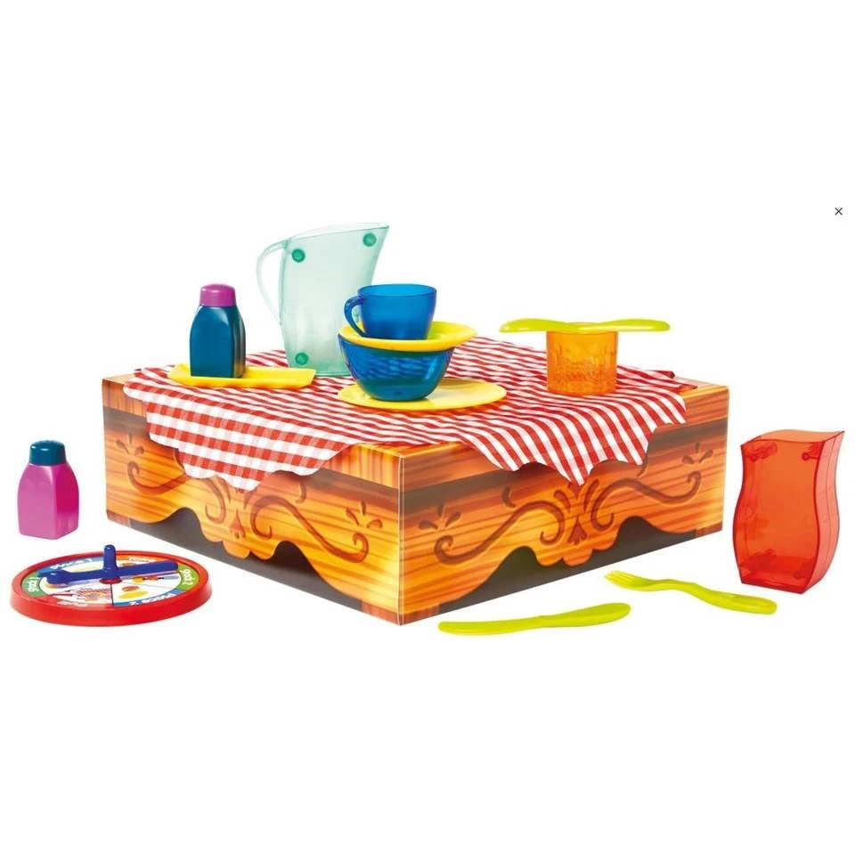 Altijd al gedroomd om van een volle tafel het tafelkleed onder het servies vandaan te trekken? Met het spel Tactic Crazy Café krijg je de kans! Maar gooi het servies niet aan diggelen! Draai aan de schijf, stapel het servies en trek het tafelkleedje weg!