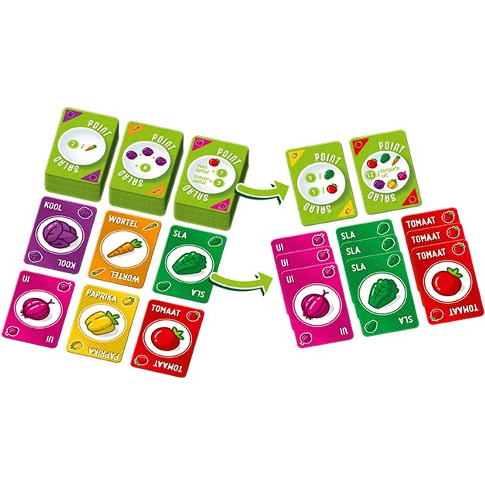 Bij dit Point Salad spel creëer je een volle salade met de groente- en puntenkaarten uit de markt. Maak de beste combinaties en win de meeste punten.