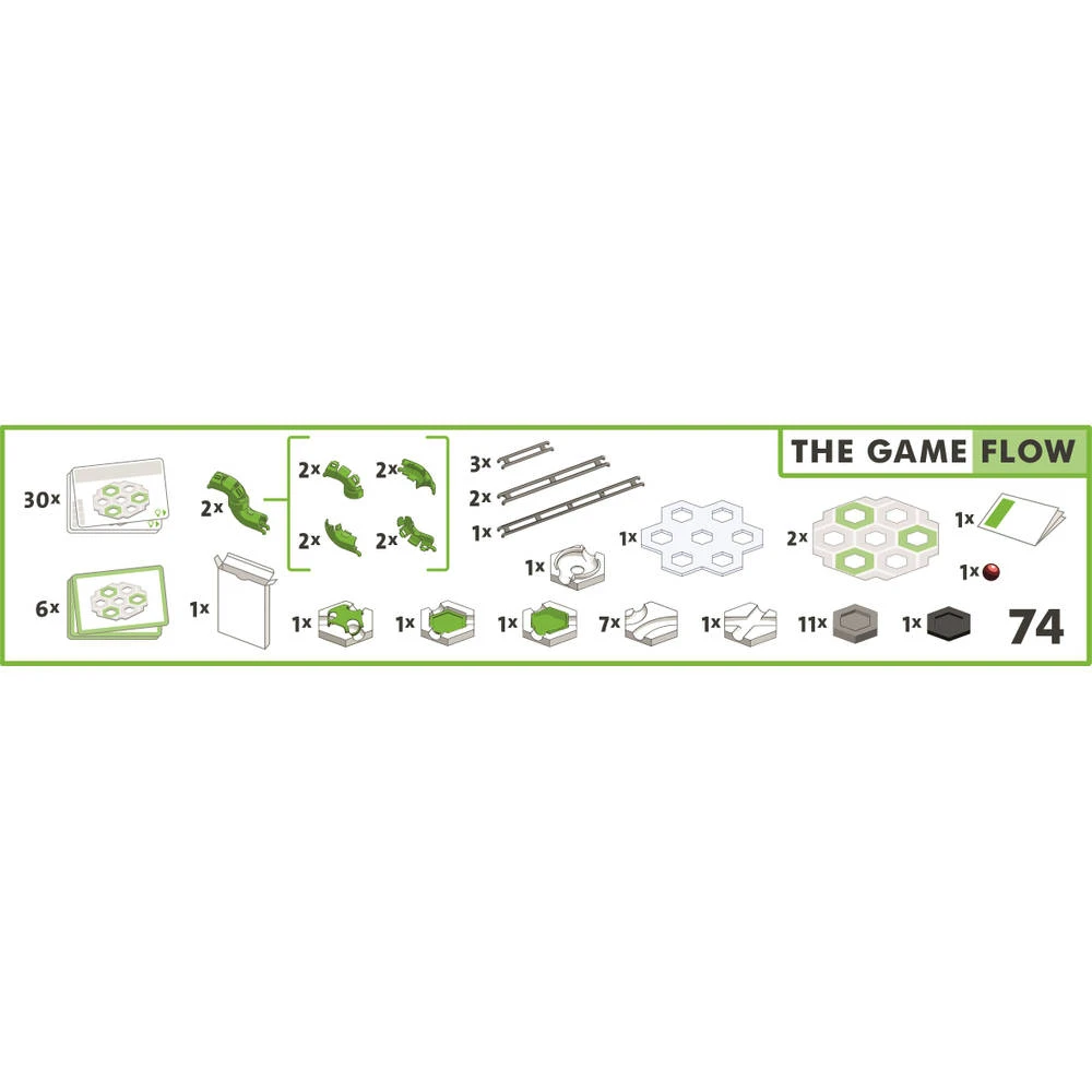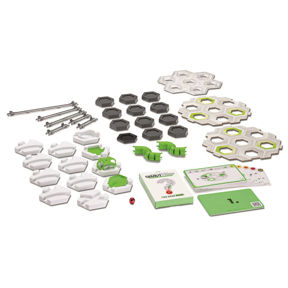 - De set bevat een instructie- en oplossingsboekje, 30 opdrachtkaarten, twee zeshoekige grondplaten, een kleine transparante etage, een startactieblokje, een kogel, twee flextubes, elf grote hoogtestenen, een kleine hoogtesteen, zeven bochten, een kruising, een lange kunststof rail, twee medium kunststof rails, drie korte kunststof rails, een werveling, twee basisblokjes en inzetstukken voor de basisstenen.